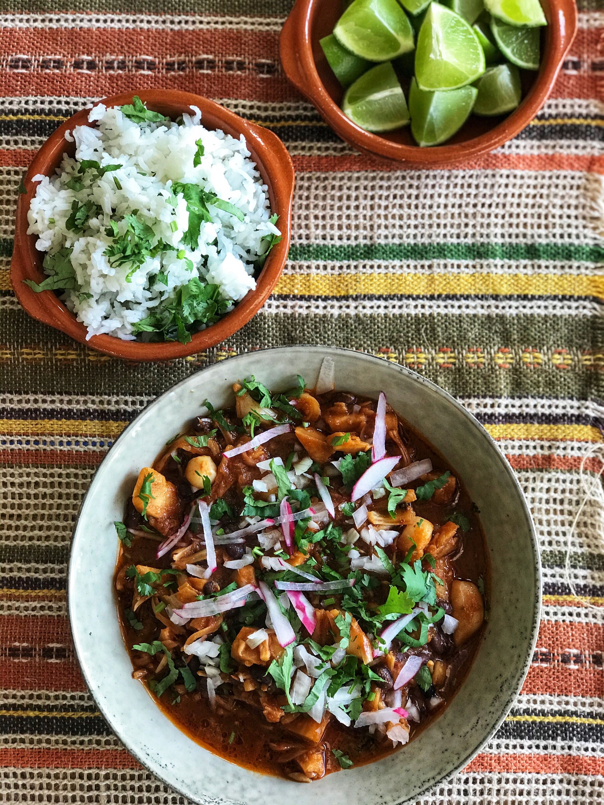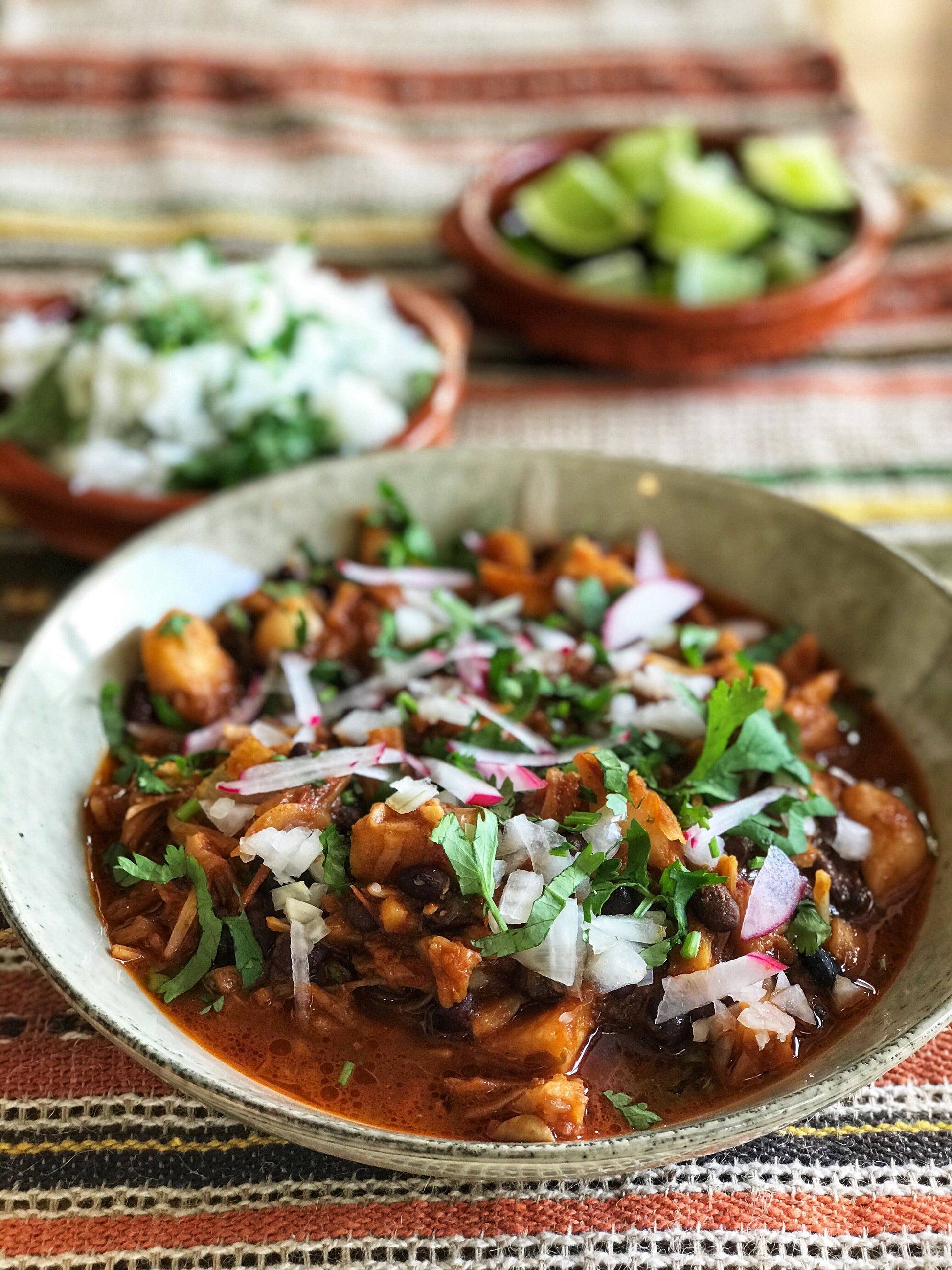 Yucatecan dish, we take jackfruit and black beans and slow cook them for hours in a rich adobo broth.